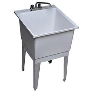 PT1 Laundry Sink Features: -Available in White finish only -Molded-in drain and stopper -Affordable utility -Includes one set of angular steel legs (4) -22 gallon capacity -Dimensions: 22'' W x 25'' D Installation ; Care Laundry Faucet Features: -Swanstone Collection -Celcon faucet for Swanstone laundry tubs -Plastic handle knobs -Available in Polished Chrome only -Built to fit Swanstone laundry tubs -Swanstone's limited lifetime warranty